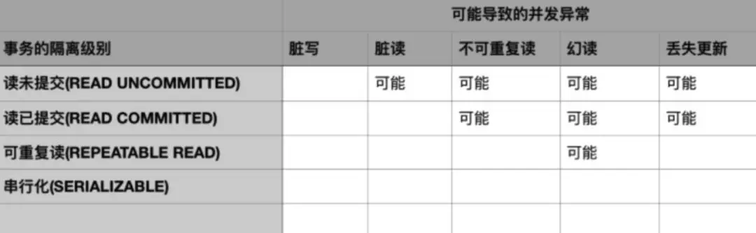 不同的隔离级别与可能的并发异常的对应情况如下表所示