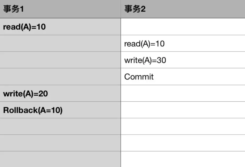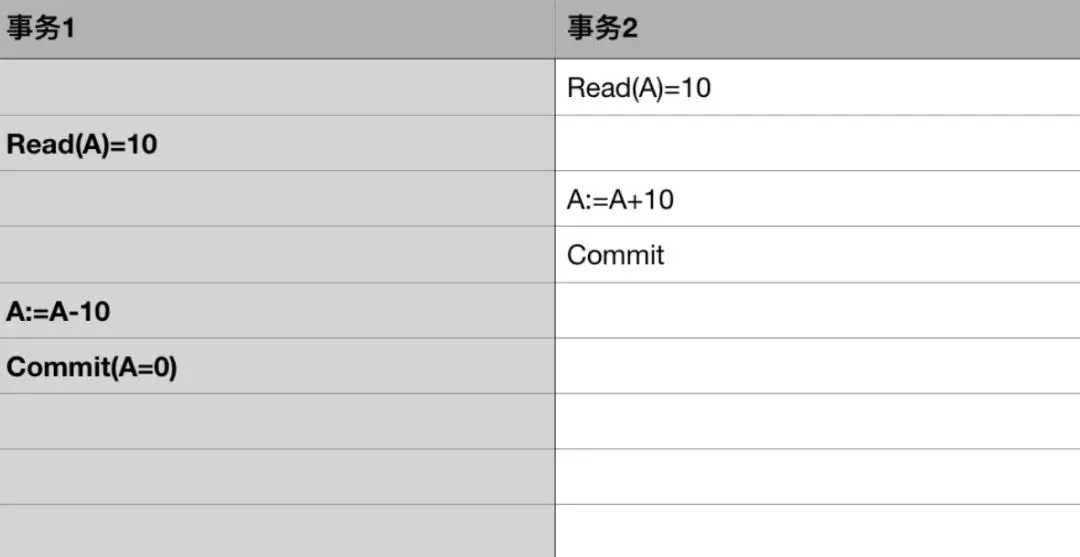 事务1和事务2读取A的值都为10,事务2先将A加上10并提交修改,之后事务2将A减少10并提交修改,A的值最后为,导致事务2对A的修改好像丢失了一样