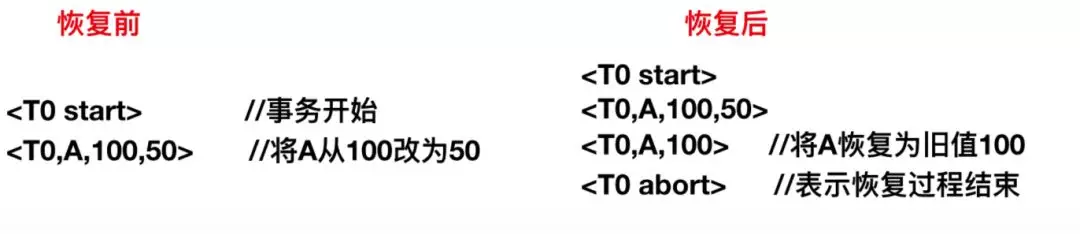 撤销事务undo:将事务更新的所有数据项恢复为日志中的旧值,事务撤销完毕时将插入一条