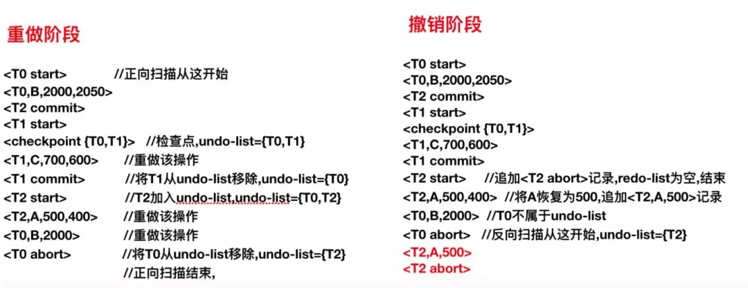 <T abort>或<T commit>记录,就把T从undo-list中去除。