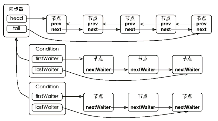 - 其实现实质是,一个Condition包含一个等待队列,定义多个Condition,那就有多个等待队列,和上文提到的同步队列配合使用。同步队列-等待队列模型请参