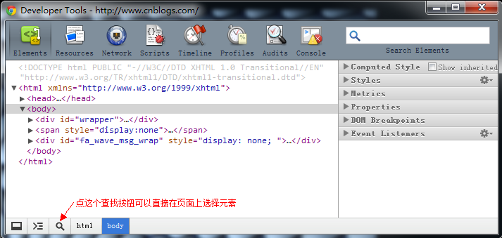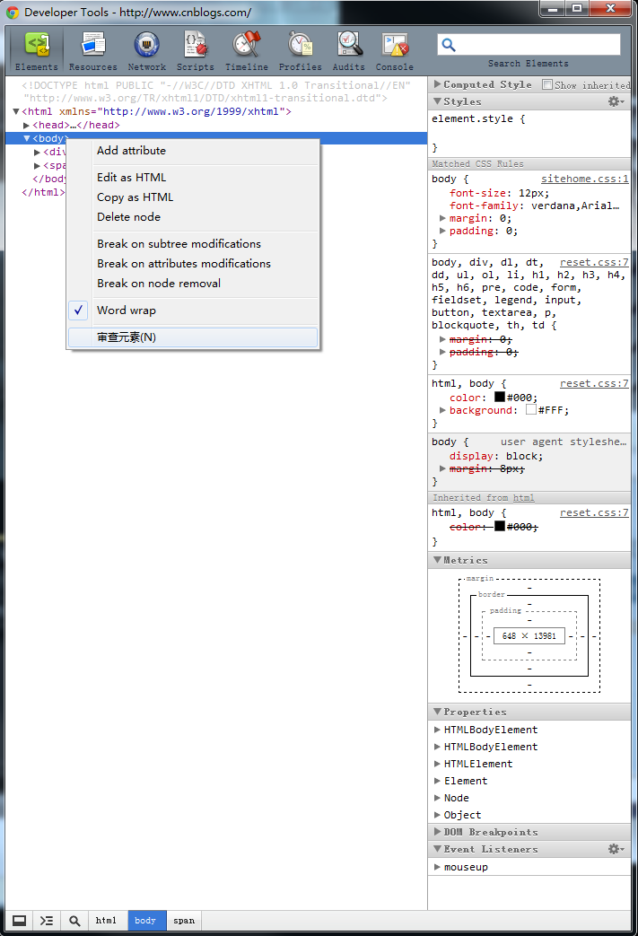 左侧就是对页面HTML结构的查看与编辑,你可以直接在某个元素上双击修改元素的属性,或者你点右键选"Edit as Html"直接对元素的HTML进行编辑,或者删除某个元素,所有的修改都会即时在页面上得到呈现。(注:看到上面右键菜单的最后一个选项"审查元素"了么?这是不是说明这个开发者工具的页面也是HTML来的呢?你点一下就知道了,嘿嘿)