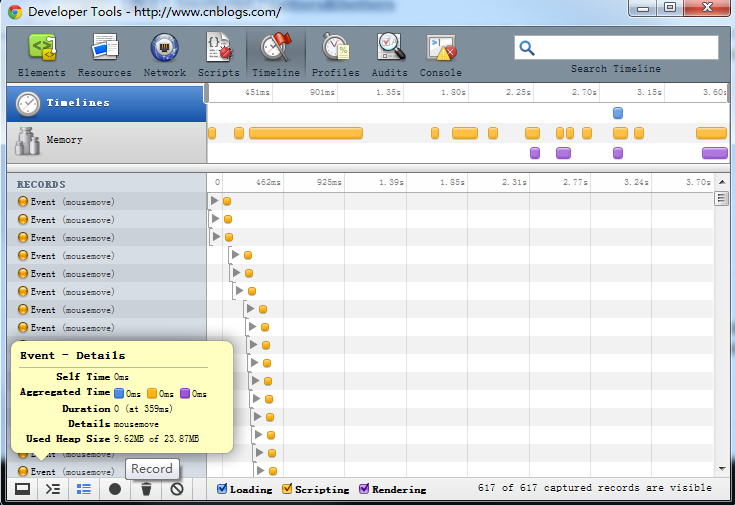注意这个Timeline的标签页不是指网络请求的时间响应情况(这个在Network标签页里查看),这个Timeline指的JS执行时间、页面元素渲染时间: