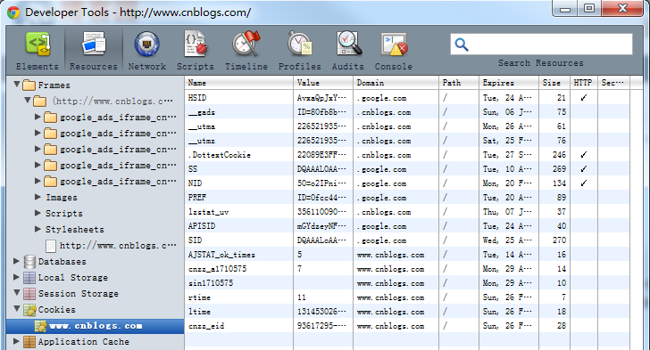 Resources标签页可以查看到请求的资源情况,包括CSS、JS、图片等的内容,同时还可以查看到存储相关的如Cookies、HTML5的Database和LocalStore等,你可以对存储的内容编辑和删除。