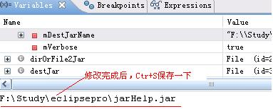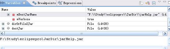 在Debug 视图的 Variables 小窗口中,我们可以看到 mDestJarName 变量的值为 " F:\Study\eclipsepro\JarDir\jarHelp,jar "