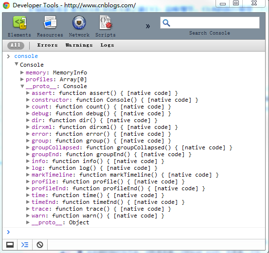 这个除了查看错误信息、打印调试信息(console,log())、写一些测试脚本以外,还可以当作Javascript API查看用。例如我想查看console都有哪些方法和属性,我可以直接在Console中输入"console"并执行: