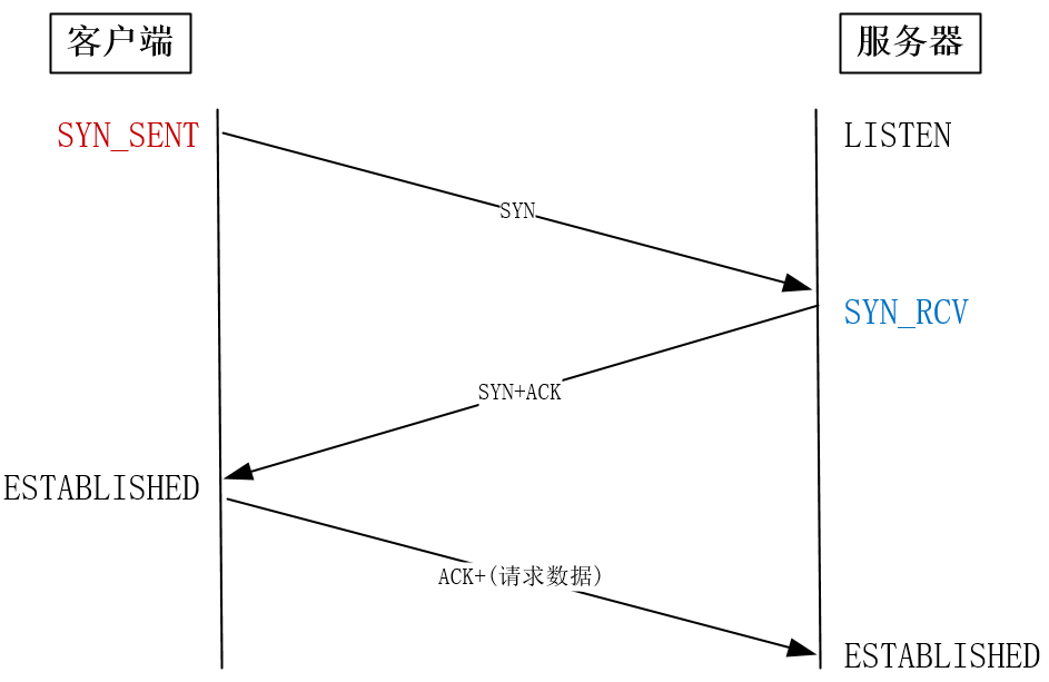 当客户端接收到服务器发来的 SYN+ACK 报文后,就会回复 ACK 去通知服务器,同时己方连接状态从 SYN_SENT 转换为 ESTABLISHED,表示连接建立成功。服务器端连接成功建立的时间还要再往后,到它收到 ACK 后状态才变为 ESTABLISHED。