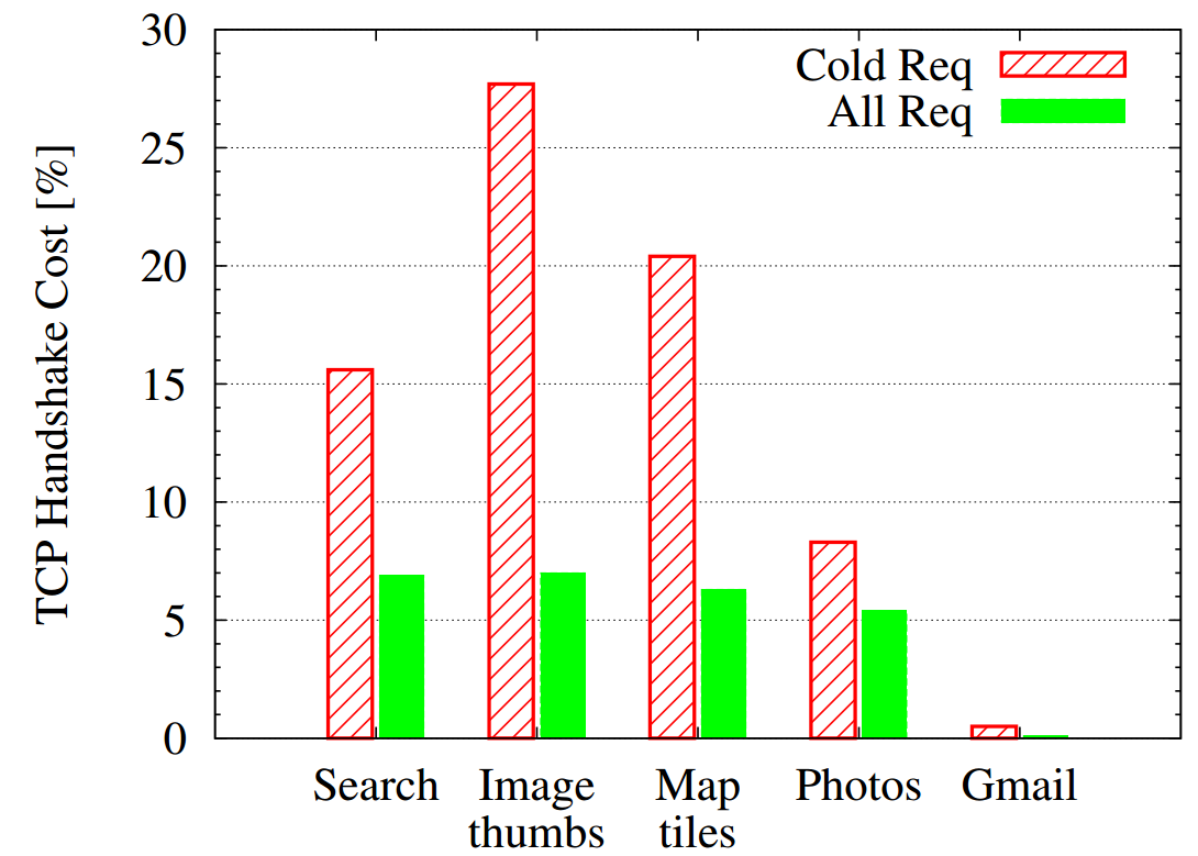 三次握手建立连接造成的后果就是,HTTP 请求必须在一次 RTT(Round Trip Time,从客户端到服务器一个往返的时间)后才能发送,Google 对此做的统计显示,三次握手消耗的时间,在 HTTP 请求完成的时间占比在 10% 到 30% 之间。