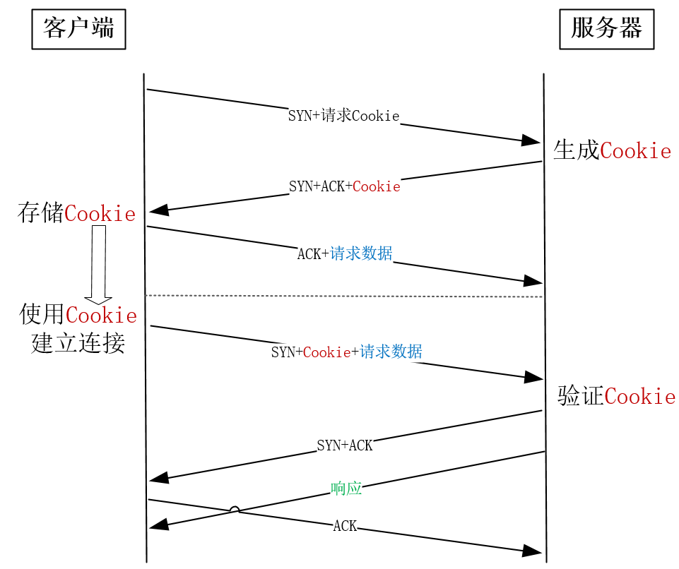 服务器收到后,会用自己的密钥验证 Cookie 是否合法,验证通过后连接才算建立成功,再把请求交给进程处理,同时给客户端返回 SYN+ACK。虽然客户端收到后还会返回 ACK,但服务器不等收到 ACK 就可以发送 HTTP 响应了,这就减少了握手带来的 1 个 RTT 的时间消耗。