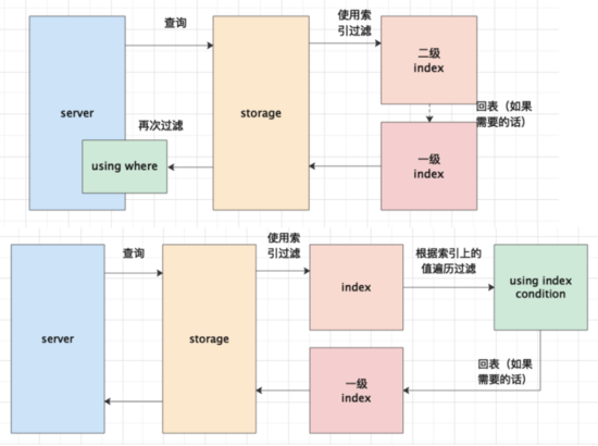 using index condition表示使用了ICP(Index Condition Pushdown索引下推),ICP是MySQL 5.6之后新增的特性,部分字段因为某些情况无法走索引查询,则会展示using where(在server层进行数据过滤),ICP是在存储引擎层进行数据过滤,而不是在服务层过滤,利用索引现有的数据过滤调一部分数据。