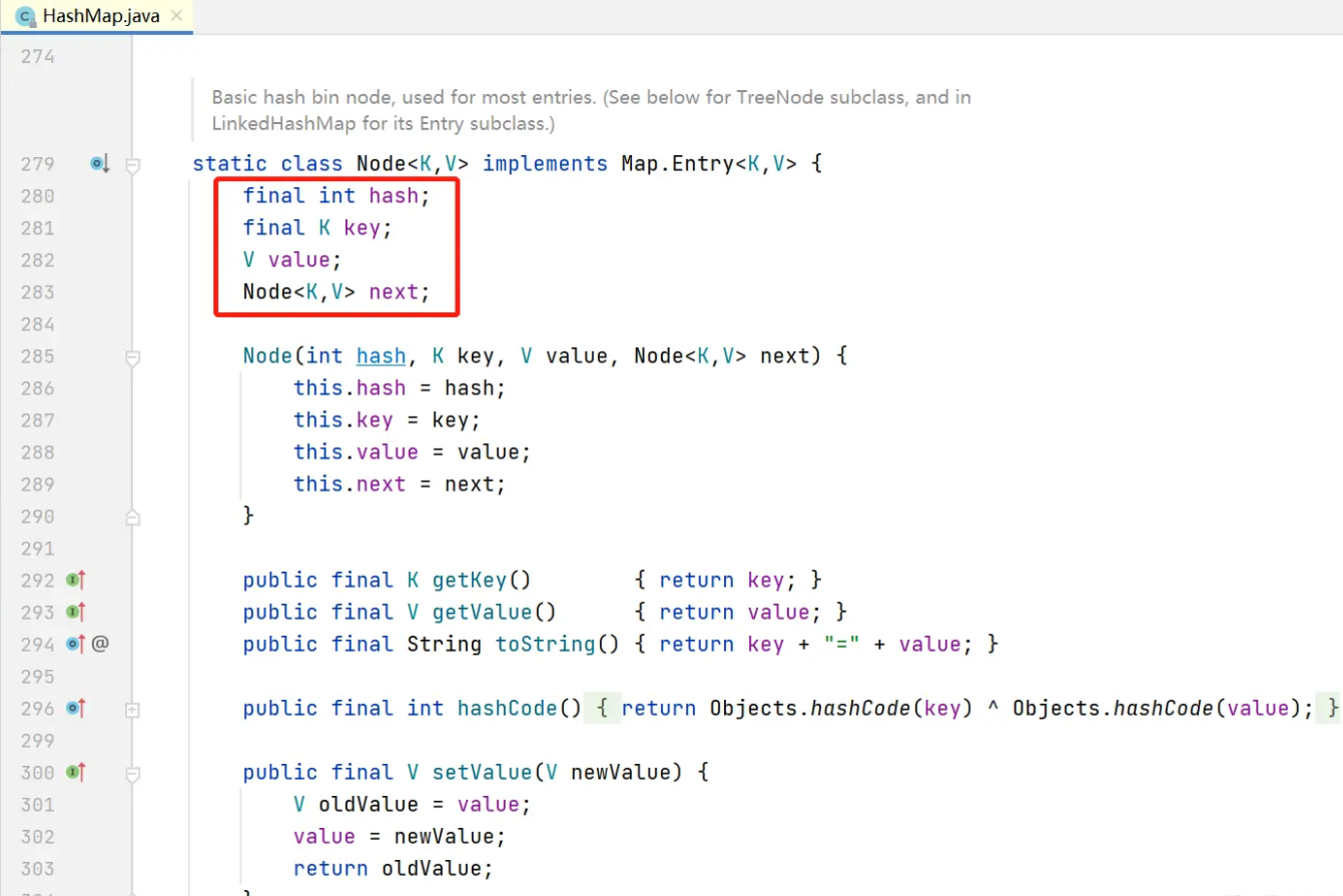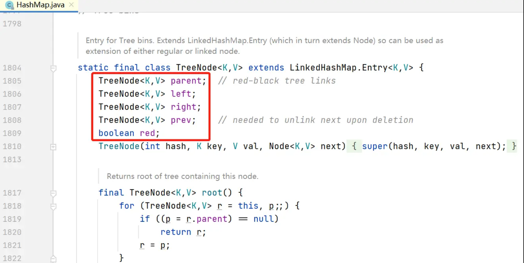 而这个 TreeNode 就是咱们这个红黑树,你看里面,还有 boolean 类型是否为红节点,