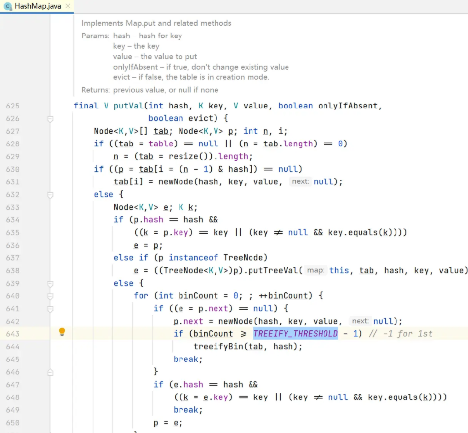 <pre class="hljs awk" style="padding: 0.5em; font-family: Menlo, Monaco, Consolas, "Courier New", monospace; color: rgb(68, 68, 68); border-radius: 4px; display: block; margin: 0px 0px 0.75em; font-size: 14px; line-height: 1.5em; word-break: break-all; overflow-wrap: break-word; white-space: pre; background-color: rgb(246, 246, 246); border: none; overflow-x: auto; font-style: normal; font-variant-ligatures: normal; font-variant-caps: normal; font-weight: 400; letter-spacing: normal; orphans: 2; text-align: start; text-indent: 0px; text-transform: none; widows: 2; word-spacing: 0px; -webkit-text-stroke-width: 0px; text-decoration-style: initial; text-decoration-color: initial;">if (binCount >= TREEIFY_THRESHOLD - 1) // -1 for 1st