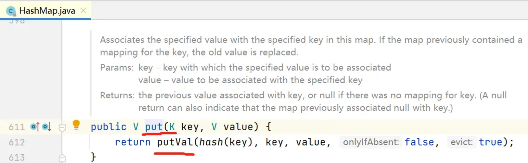 在这个地方,HashMap呢,我们主要看它的这个put方法,它调用了 putVal方法,