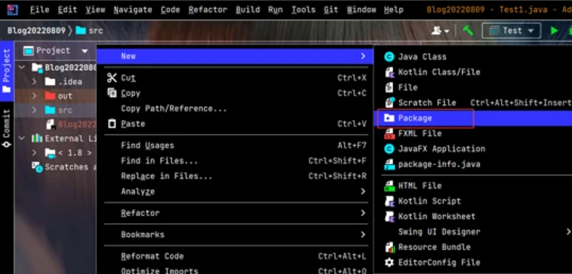 - 在 IDEA 中先新建一个包: 右键 src -> 新建 -> 包
