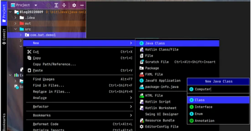 - 在包中创建类, 右键包名 -> 新建 -> 类, 然后输入类名回车即可.