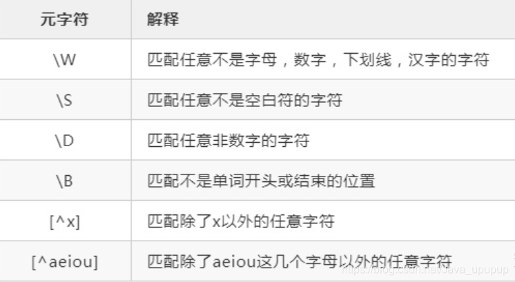 前面说到元字符的都是要匹配什么什么,当然如果你想反着来,不想匹配某些字符,正则也提供了一些常用的反义元字符: