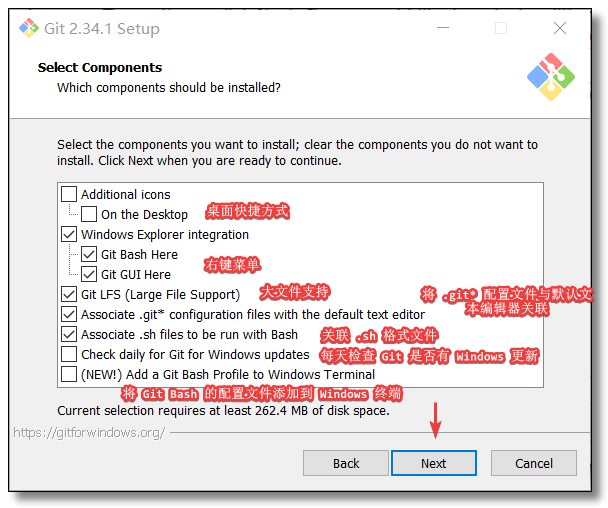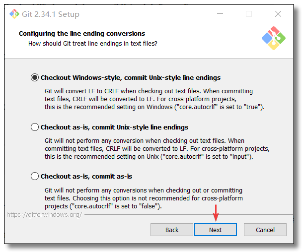 配置 Git 文件的行末换行符(Windows 使用 CRLF,Linux 使用 LF),选择第一个自动转换,然后下一步。