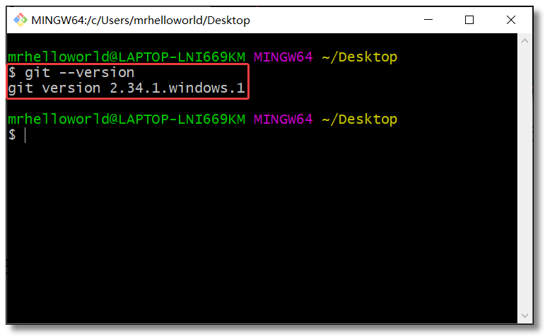 在Git Bash终端里输入git --version查看 Git 版本,如图所示,说明 Git 安装成功。
