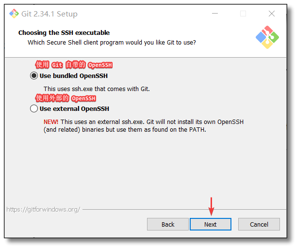 选择 OpenSSH 客户端程序,选择 Git 自带的 OpenSSH 即可,然后下一步。