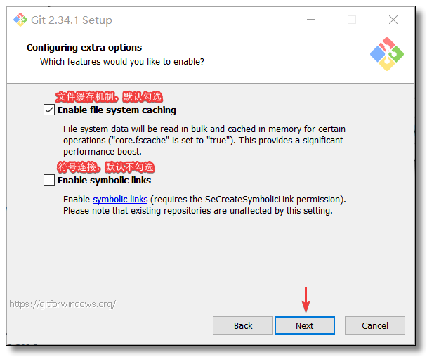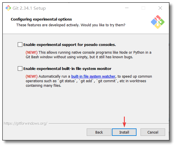 实验室功能,技术还未完全成熟,存在隐患,不推荐勾选,然后点击 Install 开始安装 Git。