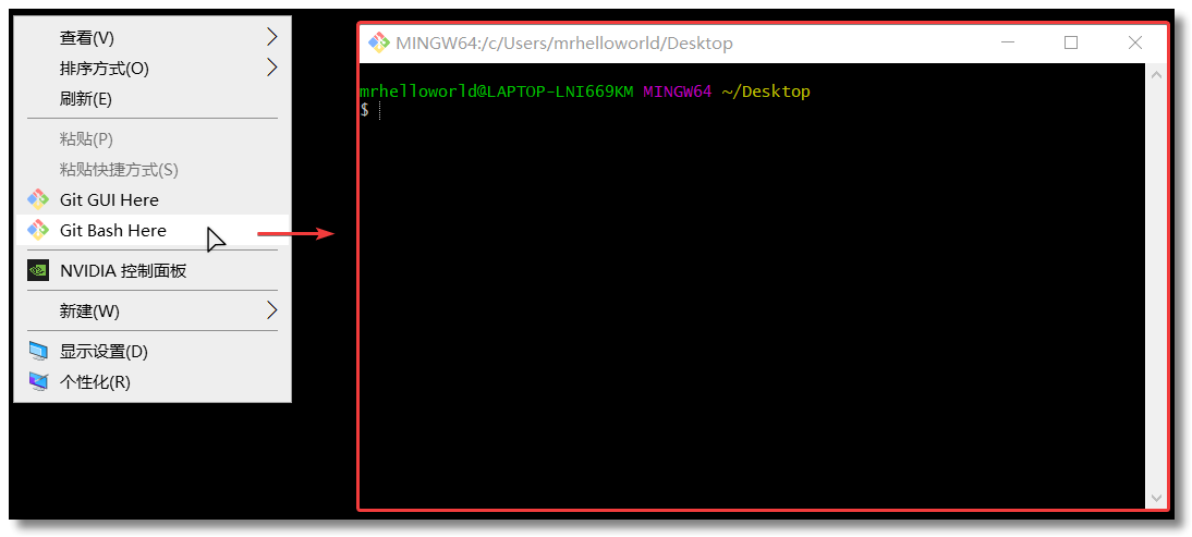 右键任意位置,在右键菜单里选择Git Bash Here即可打开Git Bash命令行终端。