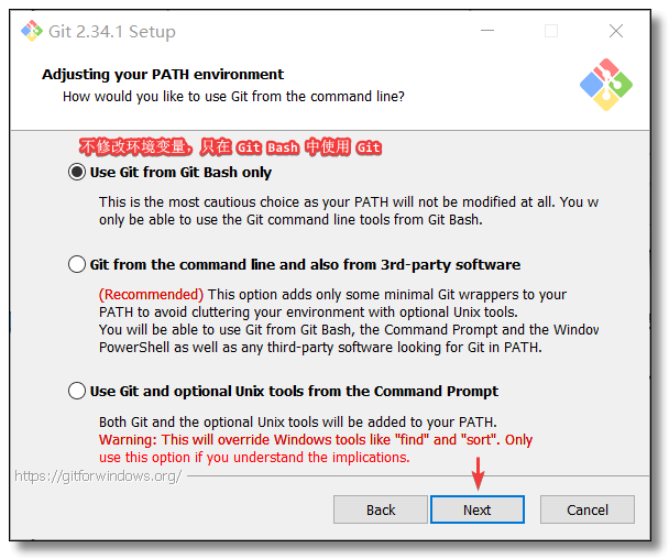 是否添加 Git 环境变量,选第一个,不修改环境变量,只在 Git Bash 中使用 Git,然后下一步。