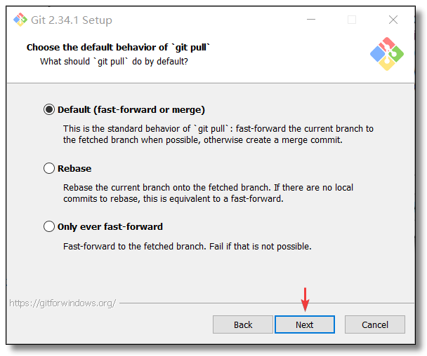 选择 git pull 合并的模式,选择默认,然后下一步。