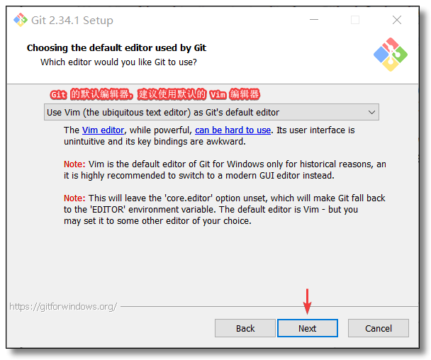 Git 的默认编辑器,建议使用默认的 Vim 编辑器,然后下一步。