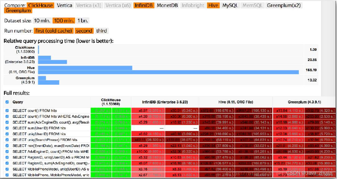 (100M数据集跑分结果,1亿数据查询速度:ClickHouse比Vertica快5倍,比Hive快279倍,比MySQL快801倍!)