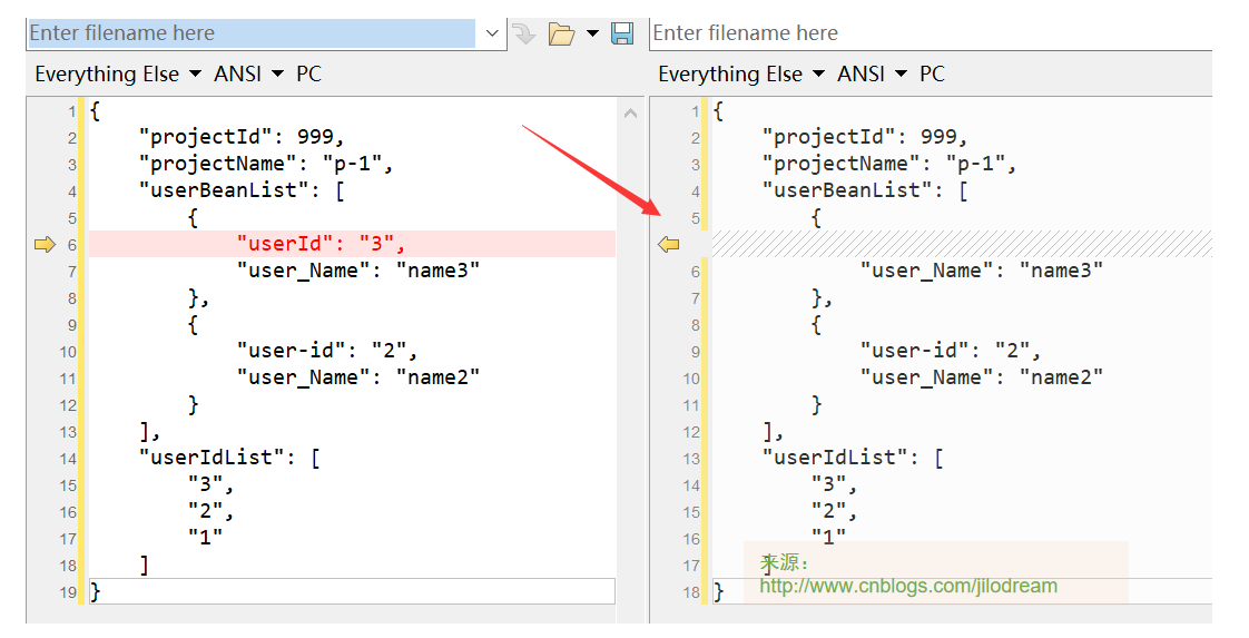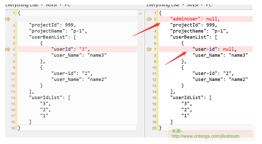 Json串我们使用场景1的输出,但是稍作修改:删掉adminUser,同时注意userBeanList容器中的元素,两个id的key不一样,一个叫做userId(类字段名),一个叫做user-id(JSONField的name值)。然后再将对象转为Json串,用这两个Json串进行比较: