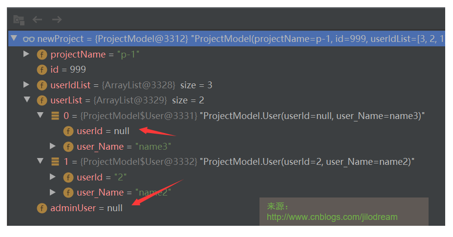 经过转换后,userId字段消失了,这是由于null值不会被序列化出来的缘故。也从侧面证明了反序列化时,如果@JSONField存在的话,必须要与@JSONField值保持一致,否则字段值不会写入。如图: