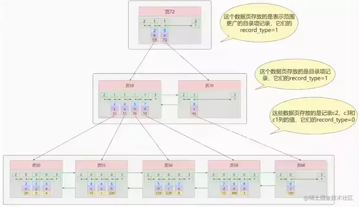 迭代一中的目录项是怎么存储的呢?我们是不是也可以用行记录格式存储到数据页中呢。答案是肯定的,我们通过行记录格式中的record_type等于1表示是目录记录,如下图所示: