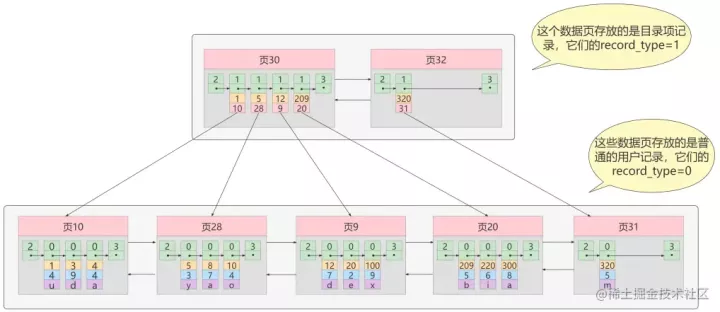 再到存储用户记录的页9中根据二分法快速定位到主键值为20的用户记录。
