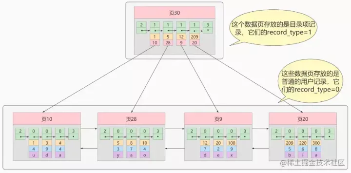 先到存储目录项记录的页,也就是页30中通过二分法快速定位到对应目录项,因为 12 < 20 < 209 ,所以定位到对应的记录所在的页就是页9。