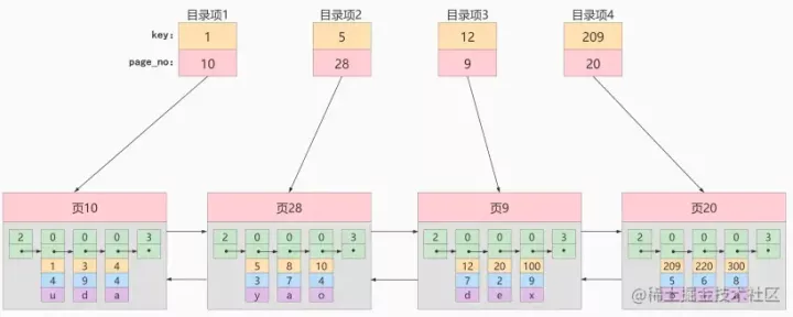 先从目录项中根据二分法快速确定出主键值为 20 的记录在 目录项3 中(因为 12 < 20 < 209 ),它对应的页是页9。