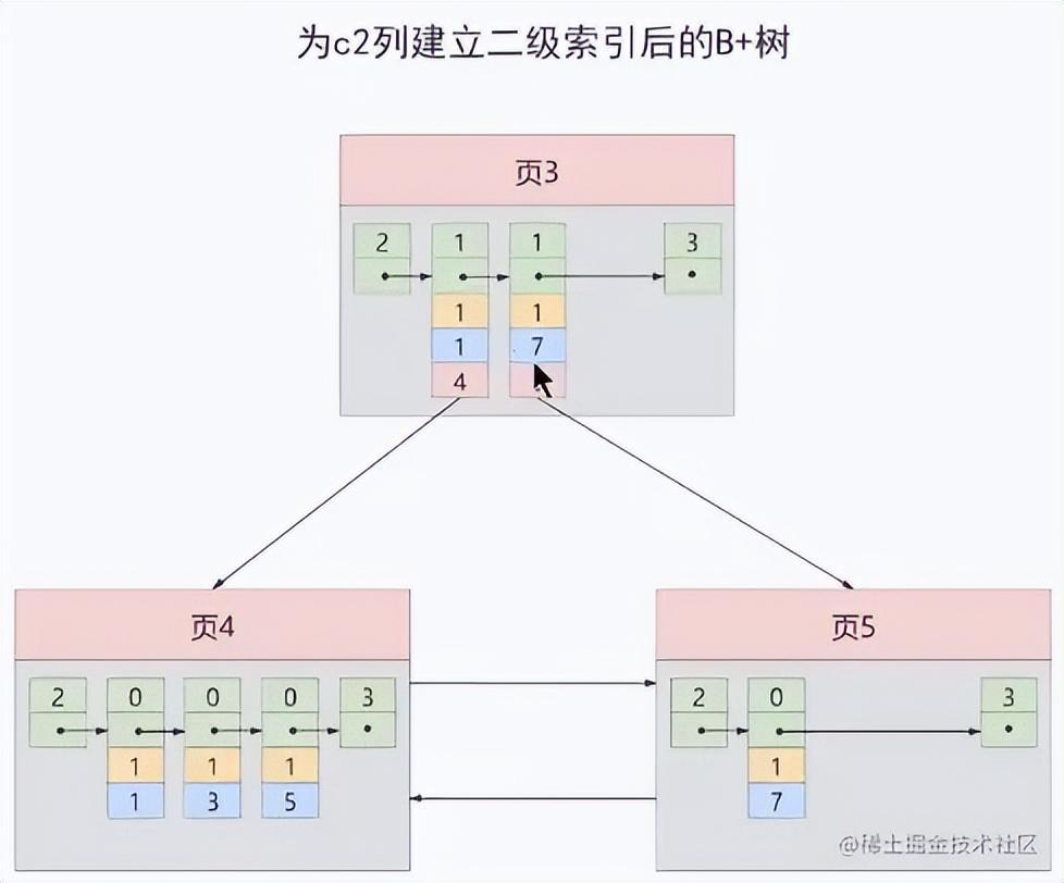 比方说我们想让B+树按照c2和c3列的大小进行排序,为c2和c3建立的索引的示意图如下: