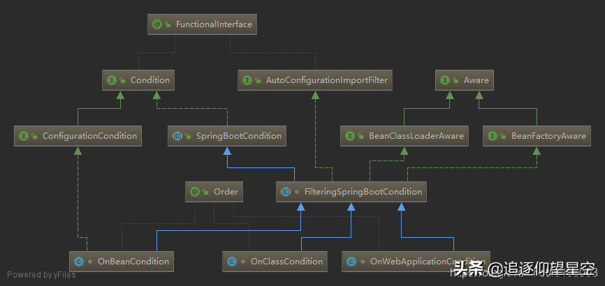 这里注解点进去看会发现每个注解上都标注了@Conditional注解,并且value值都对应一个类,比如OnBeanCondition,而这些类都实现了Condition接口,看看其继承体系: