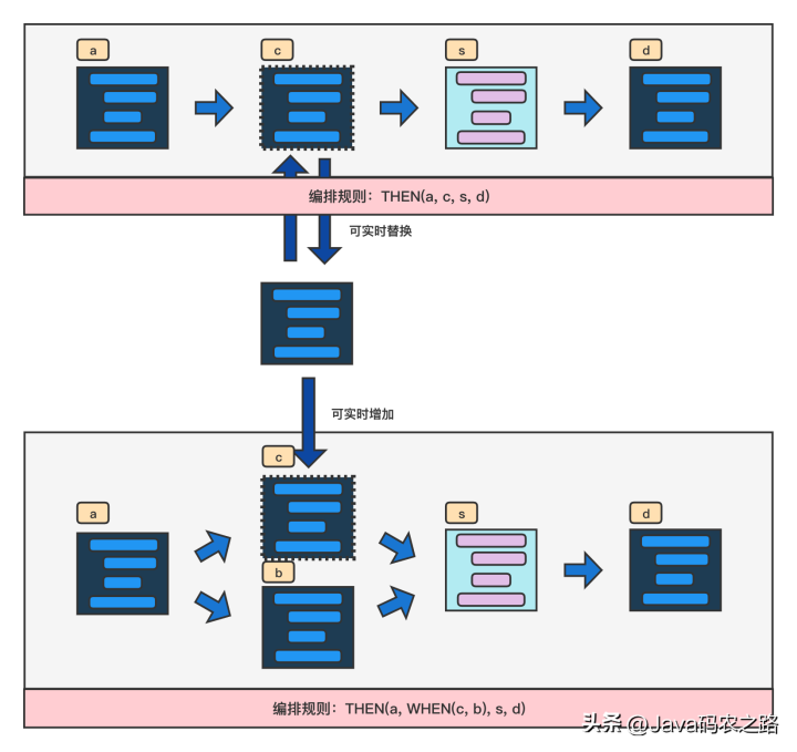 业务链路中组件可实时更换,也可实时增加,形成一个新的业务链。同时定义好的组件也可复用在其他的链路中。