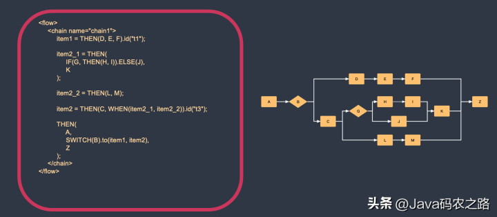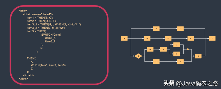 这种模式的好处就是,不需要热更新的部分可以用java组件来写,需要经常变的部分可以用脚本来写。所有的组件均可混搭成为一个业务。如何编排这些组件,LiteFlow独创了ELF语法,拥有非常好上手的编排语法。程序员的话,十分钟就可以上手。上图粉色部分就是最简单的一种串联形式。