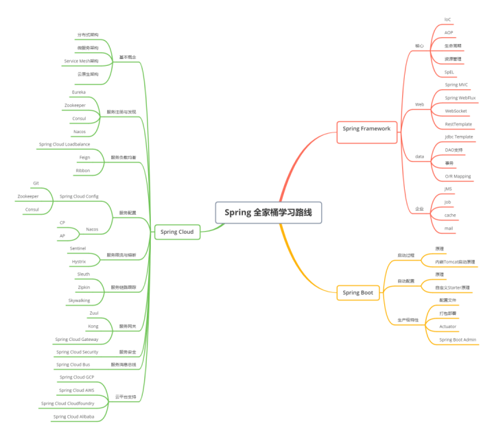 接下来就是Spring全家桶的思维脑图,其实就是让大家先预览一下Spring的知识点大纲,心里有个谱。