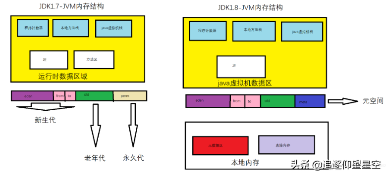 JDK 1.8 同 JDK 1.7 比,最大的差别就是:元数据区取代了永久代。元空间的本质和永久代类似,都是对 JVM 规范中方法区的实现。不过元空间与永久代之间最大的区别在于:元数据空间并不在虚拟机中,而是使用本地内存