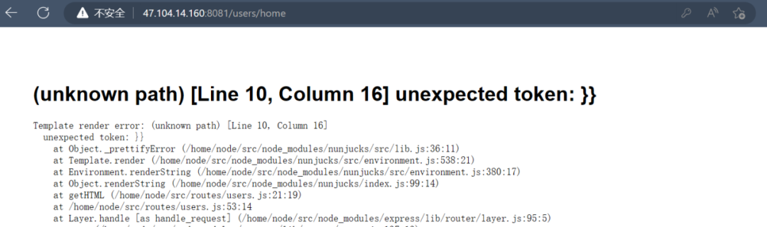 首先尝试{{7*7}},发现它成功执行49,于是在确定是什么类型的模板引擎,我们尝试{{}}进行报错,发现是Nunjucks引擎