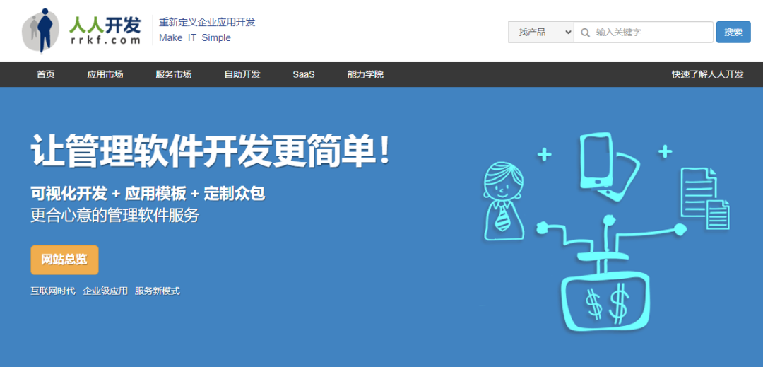 人人开发基于可视化快速开发平台,集众多开发者资源,为企业提供企业管理软件服务。应用市场提供应用产品、插件的在线试用和销售,服务市场以威客众包模式提供管理软件定制开发服务,各类企业级应用开发服务,例如:协同OA产品,ERP,CRM,人事管理,项目管理,资产管理,设备管理等