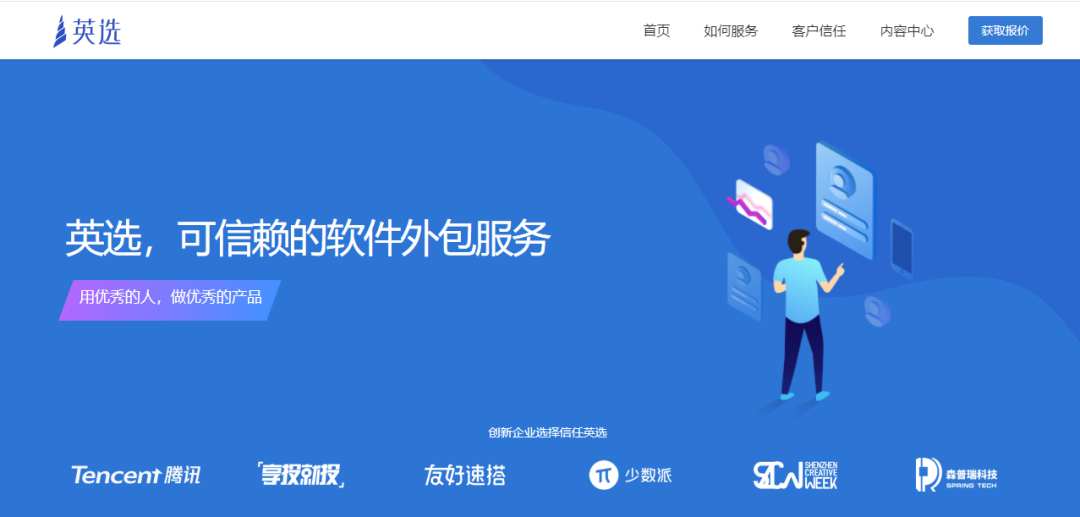 英选是一个可信赖的软件外包服务平台,口号是用优秀的人,做优秀的产品。