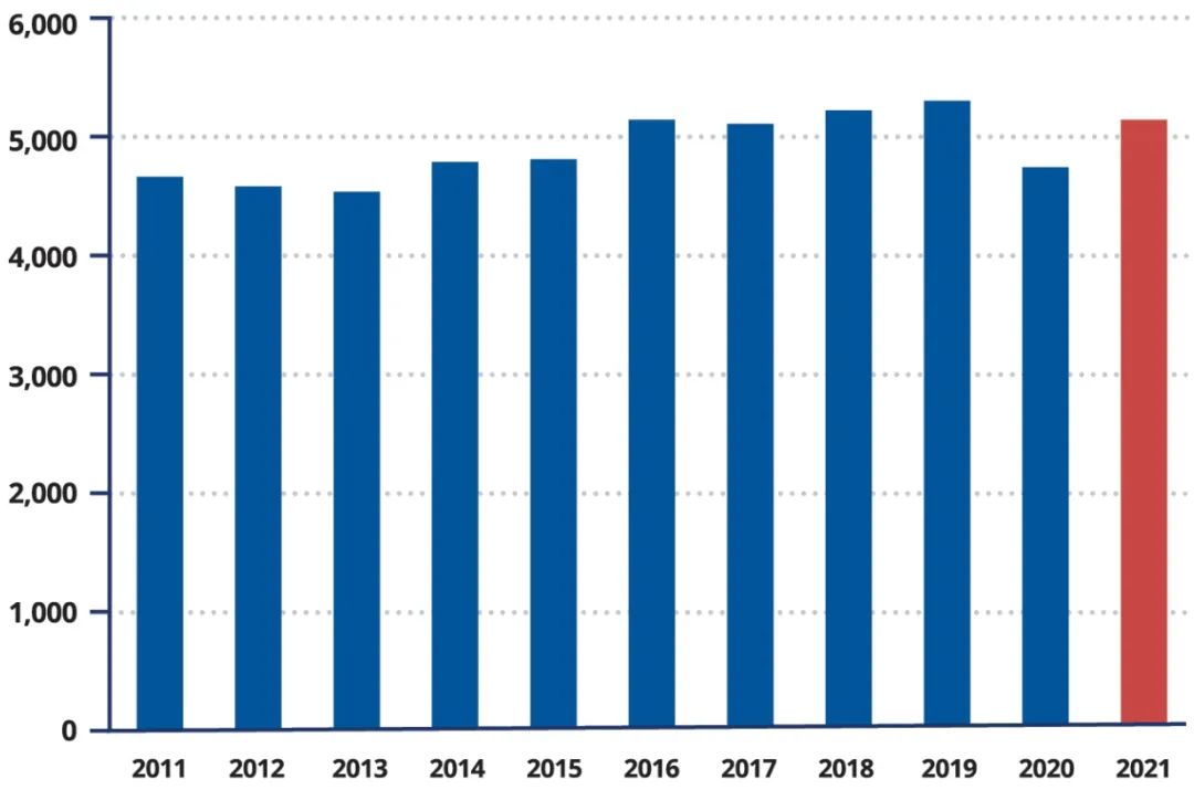 ▲图1: 2011年至2021年致命工伤人数统计:美国劳工统计局的数据显示,企业安全情况几乎没有明显的改善。在美国,平均每101分钟就有1名工人死于工伤事故。
