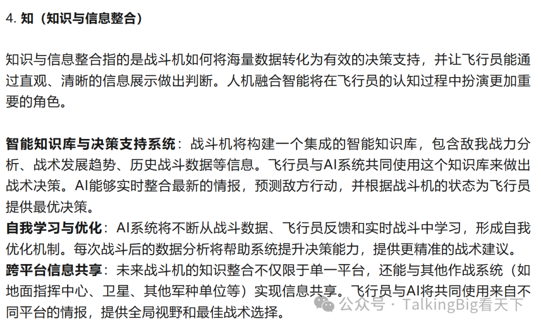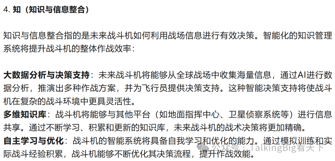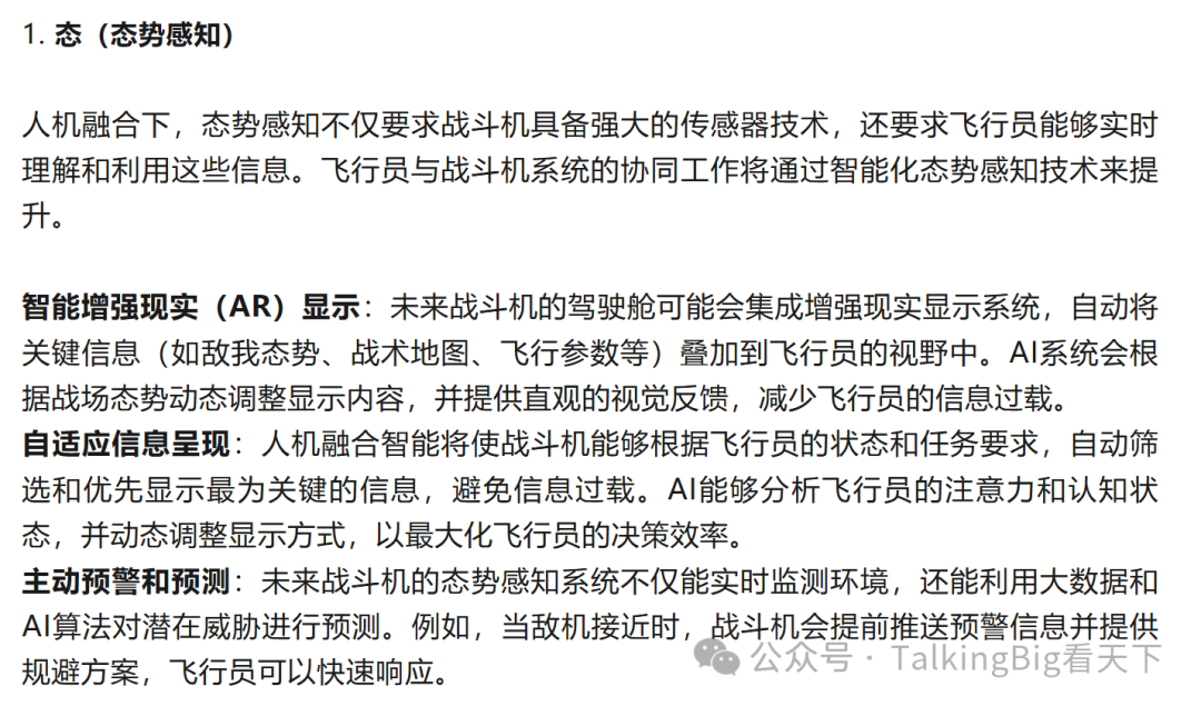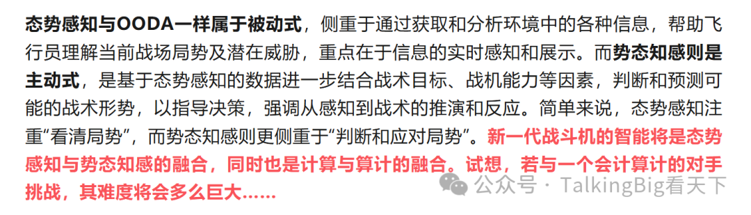 上面,是文章的观点。我尝试理解其中的表述和含义。核心一点,就是通过强大的信息的融合处理能力,借助强大的算法,计算机实现自主决策,同时能够为飞行员提出决策建议。这个过程,就是态势感知。