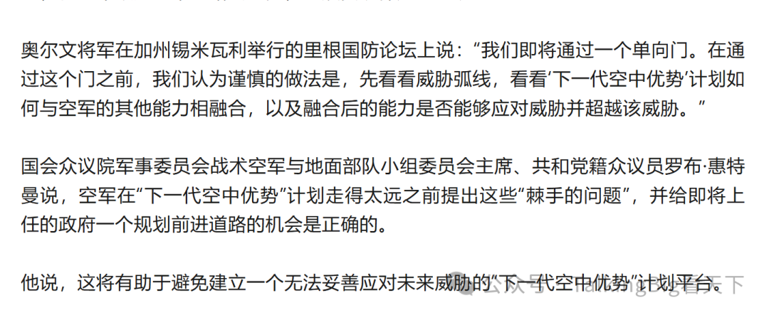 正如奥尔文将军在加州锡米瓦利举行的里根国防论坛上所说,“我们即将通过一个单向门。在通过这个门之前,我们认为谨慎的做法是,先看看威胁弧线,看看‘下一代空中优势’计划如何与空军的其他能力相融合,以及融合后的能力是否能够应对威胁并超越该威胁。“