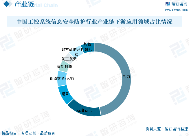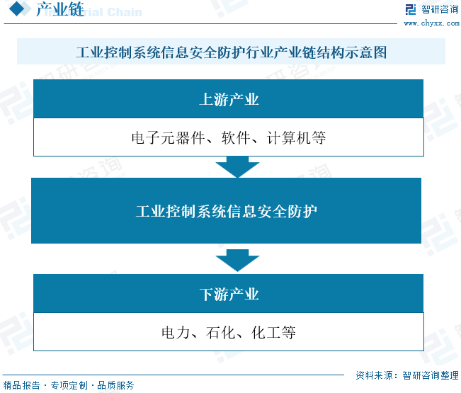 工业控制系统信息安全防护行业产业链上游由电子元器件、软件、计算机等领域组成;产业链中游为工业系统信息安全防护行业;产业链下游为应用领域,工业控制系统信息安全防护行业应用领域众多,主要为电力、石化、化工等。