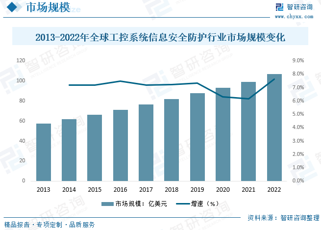 全球工控系统信息安全防护行业是一个关键的领域,它致力于保护工业控制系统(Industrial Control Systems,ICS)免受网络攻击和数据泄露的威胁。随着工控系统的数字化程度不断提高,它们变得更容易受到各种网络威胁的攻击。从勒索软件到有针对性的攻击,这些威胁催生了对工控系统信息安全的巨大需求。根据数据显示,全球工业控制系统信息安全防护行业市场规模呈现稳步上涨,2022年全球工业控制系统信息安全防护行业市场规模约为106.74亿美元。
