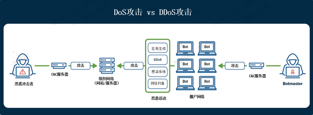 DoS和DDoS攻击的相似之处在于其目的都是破坏目标系统或网络的可用性,但两者之间也存在重要的差别。
